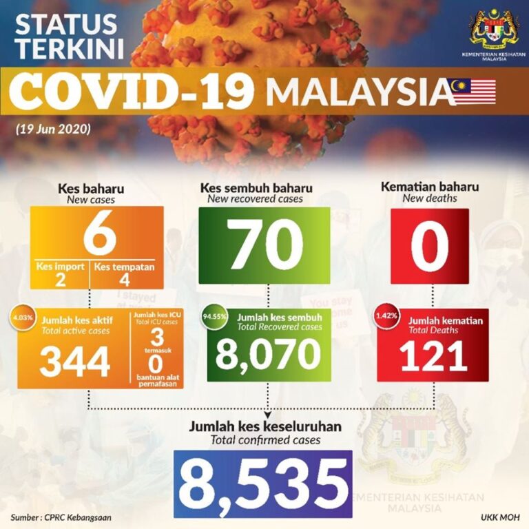 Terkini #covid19malaysia, 19 Jun Kes sembuh = 70Jumlah kes sembuh = 8,070 Kes baharu positif = 6(Import = 2Kes penularan tempatan = 4) Jumlah positif = 8,535 Kes kematian = 0Jumlah Kes kematian = 121 kes dirawat di ICU = 3 […]