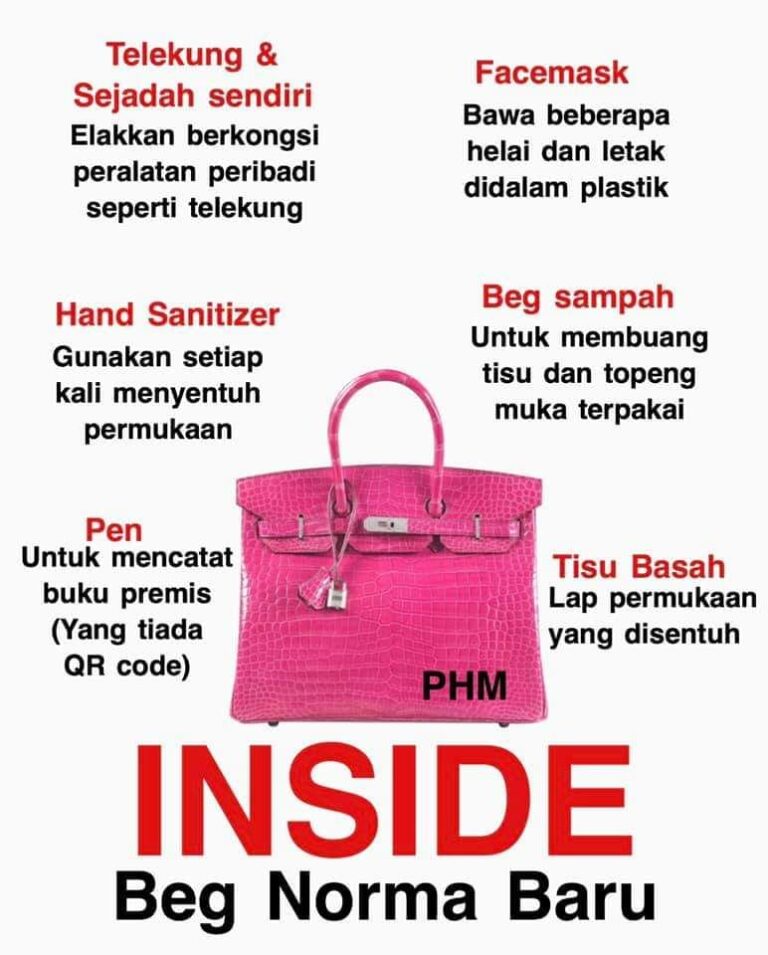 Dalam situasi pandemik kini, apakah yang perlu dibawa setiap kali anda keluar rumah? Ya, memang lebih banyak persediaan yang perlu dilakukan. Selain itu, Ini mungkin alasan yang baik untuk memiliki beg tangan baru ?. Sumber : Public Health Malaysia