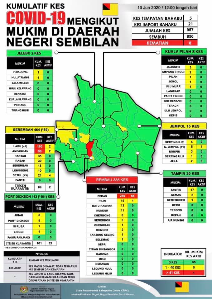 Sehingga 13 Jun 2020, jam 12.00 tengah hari, terdapat 26 KES BARU positif COVID-19 dilaporkan ke Crisis Preparedness and Response Centre (CPRC) Jabatan Kesihatan Negeri, Negeri Sembilan, menjadikan jumlah keseluruhan kes COVID-19 sebanyak 957 kes. Dari jumlah tersebut, sebanyak 279 […]