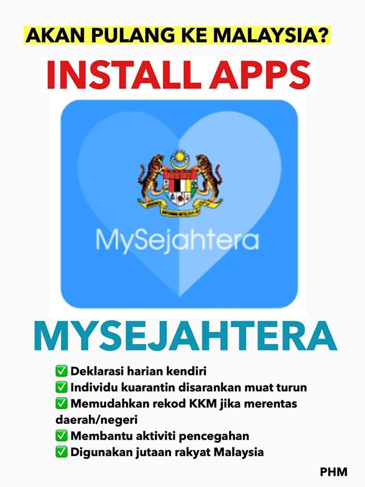 Semua warga Malaysia digalakkan untuk memuat turun aplikasi MySejahtera. Jika anda individu yang dikuarantinkan, anda juga disaran untuk memuat turun aplikasi dan mendaftar sebelum anda sampai ke kaunter Imigresen Malaysia. Sumber : Public Health Malaysia