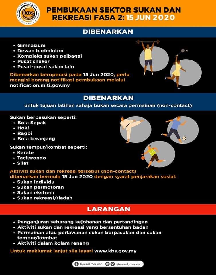Ringkasan SOP Pembukaan Sektor Sukan dan Rekreasi Fasa 2 – Pautan borang notifikasi pembukaan Kompleks dan Pusat Sukan: https://notification.miti.gov.my/login – Maklumat lanjut SOP Pembukaan Sektor Sukan dan Rekreasi Fasa 2: http://www.kbs.gov.my/ Kredit : KBSMalaysia