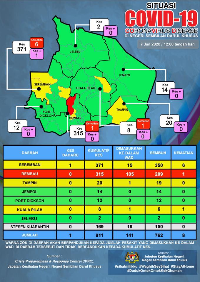 Sehingga 7 Jun 2020, jam 12.00 tengah hari, terdapat SATU (1) KES BARU positif COVID-19 dilaporkan ke Crisis Preparedness and Response Centre (CPRC) Jabatan Kesihatan Negeri, Negeri Sembilan, menjadikan jumlah keseluruhan kes COVID-19 sebanyak 911 kes. Dari jumlah tersebut, sebanyak […]