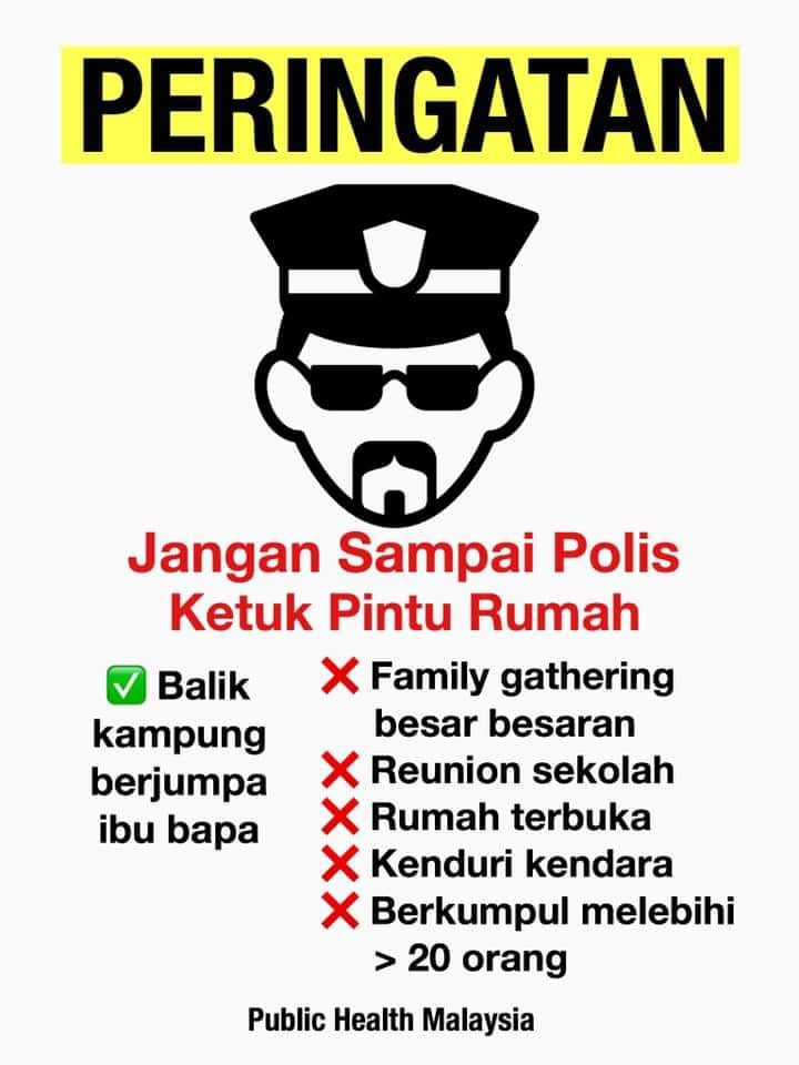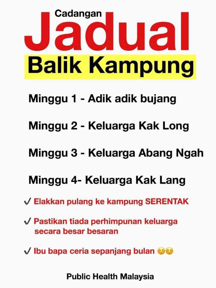 Aturkan perjalanan supaya tiada perhimpunan besar besaran di rumah. Beri giliran kepada adik adik bujang dahulu kerana mereka beraya bersendirian sebelum ini. Sumber : Public Health Malaysia