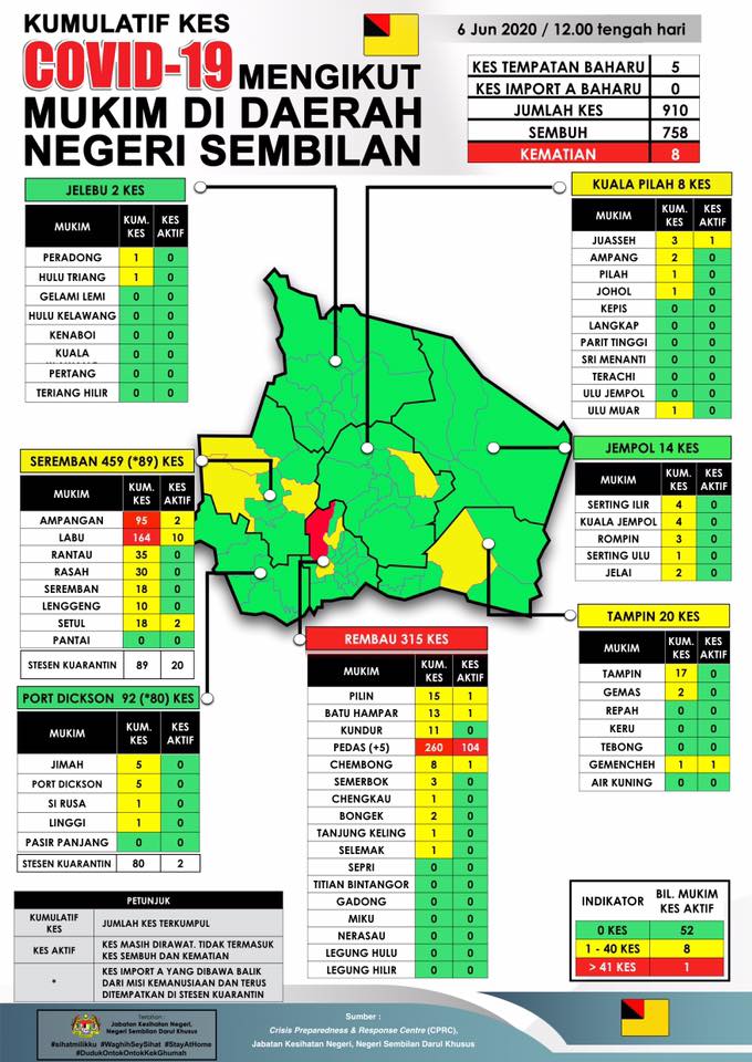 Sehingga 6 Jun 2020, jam 12.00 tengah hari, terdapat LIMA (5) KES BARU positif COVID-19 dilaporkan ke Crisis Preparedness and Response Centre (CPRC) Jabatan Kesihatan Negeri, Negeri Sembilan, menjadikan jumlah keseluruhan kes COVID-19 kekal sebanyak 910 kes. Daripada jumlah tersebut, […]