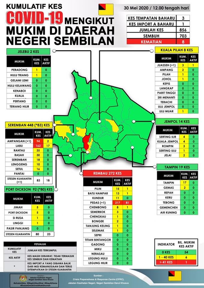 Sehingga 30 Mei 2020, jam 12.00 tengah hari, terdapat EMPAT (4) KES BARU positif COVID-19 dilaporkan ke Crisis Preparedness and Response Centre (CPRC) Jabatan Kesihatan Negeri, Negeri Sembilan, menjadikan jumlah keseluruhan kes COVID-19 sebanyak 856 kes. Daripada jumlah tersebut, sebanyak […]