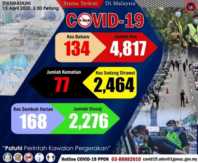 Situasi terkini 13 April 2020 #COVID19 di Malaysia : Sebanyak 134 kes baru menjadikan jumlah keseluruhan 4,817 kes. 168 kes telah pulih menjadikan 2,276 pesakit telah pulih dan discaj. 1 kematian dicatatkan menjadikan jumlah keseluruhan kematian sebanyak 77 kes. Jangan risikokan diri […]