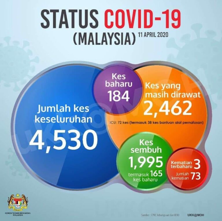 Status #COVID19Malaysia sehingga jam 5 petang pada 11 April 2020. Keseluruhan kes positif 4,530 dengan 44.04.% telah sembuh bersamaan 1,995 pesakit dan 1.61% atau 73 kematian. #StayAtHome#BreaktheChain#KitaMestiMenang
