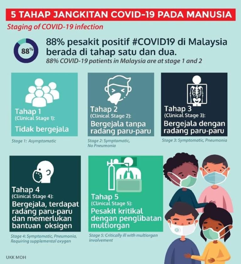 Lima tahap jangkitan COVID-19 pada manusia. 88% pesakit di Malaysia berada tahap satu dan dua. Staging of COVID-19 infection. 88% patients in Malaysia are at stage 1 and 2. #StayAtHome#dudukrumah#KitaJagaKita
