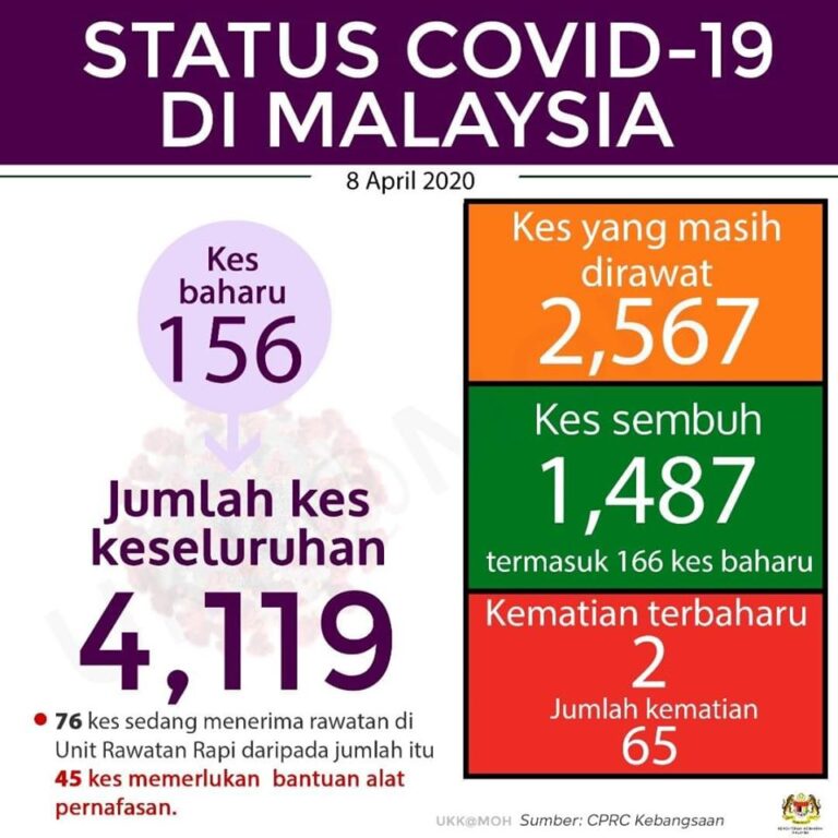 Status #COVID19Malaysia sehingga jam 5 petang pada 08 April 2020. Keseluruhan kes positif 4,119 dengan 36.10.% telah sembuh bersamaan 1,487 pesakit dan 1.58% atau 65 kematian. #StayAtHome#BreaktheChain#KitaMestiMenang