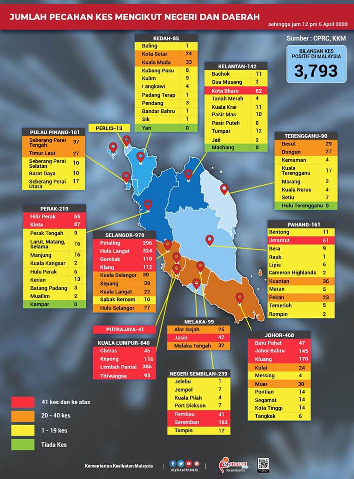 Terdapat pertambahan zon merah menjadi 21, berdasarkan statistik terkini sehingga 12pm, 6 April. Daerah baru zon merah ialah Putrajaya, Jasin dan Rembau. Duduk di rumah, penjarakan sosial dan tingkatkan penjagaan kesihatan diri. Sumber : CPRC KKM #StayAtHome#staysafe