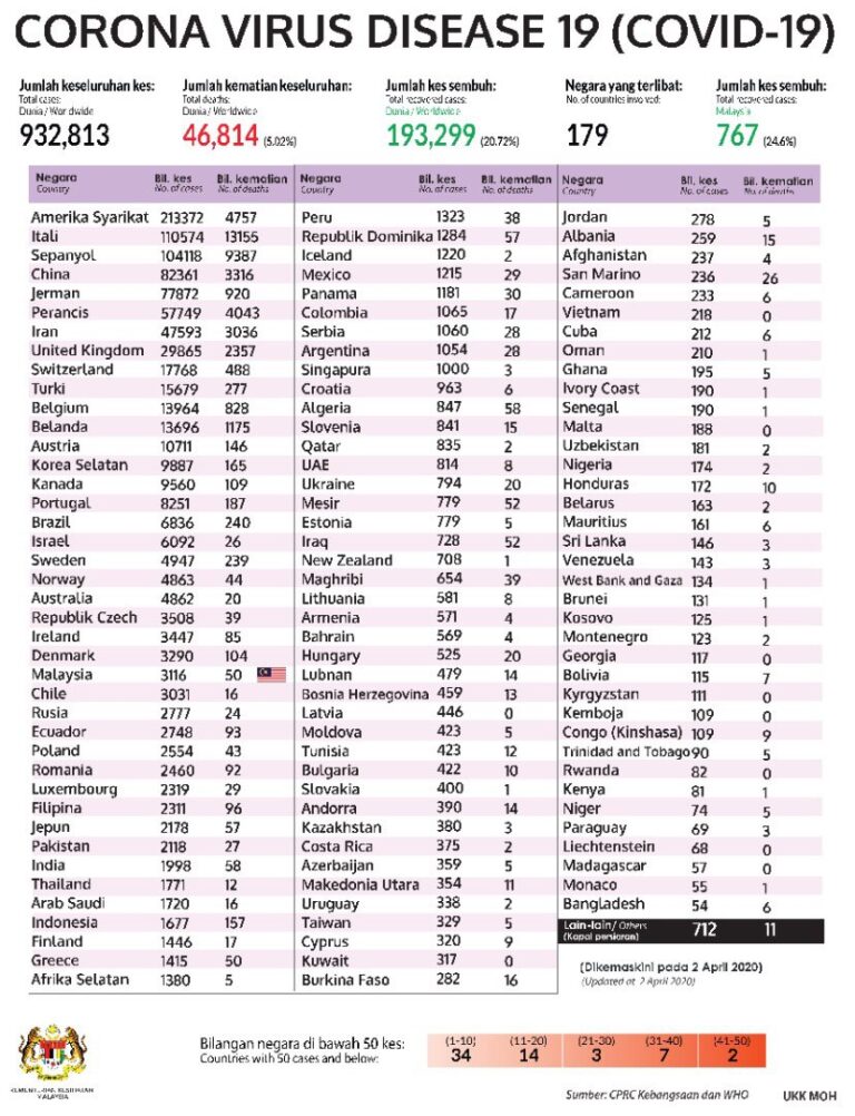 Status COVID-19 di Malaysia sehingga jam 5 petang pada 2 April 2020.Keseluruhan kes positif 3,116 dengan 24.61% telah sembuh bersamaan 767 pesakit dan 1.6% atau 50 kematian.