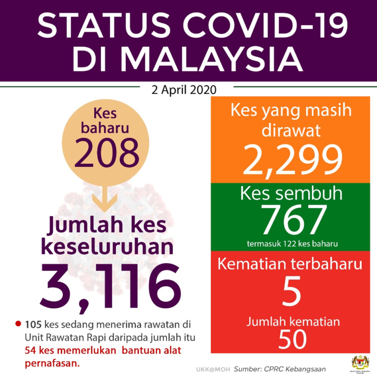 Status COVID-19 di Malaysia sehingga jam 5 petang pada 2 April 2020.Keseluruhan kes positif 3,116 dengan 24.61% telah sembuh bersamaan 767 pesakit dan 1.6% atau 50 kematian.