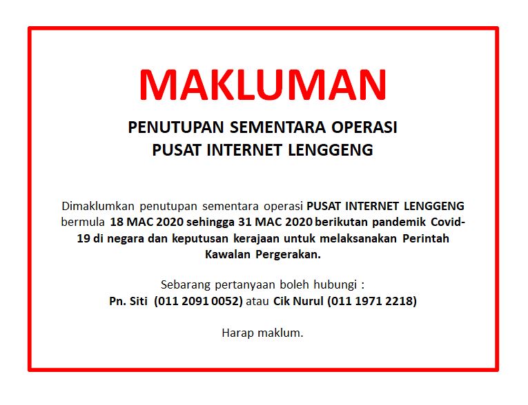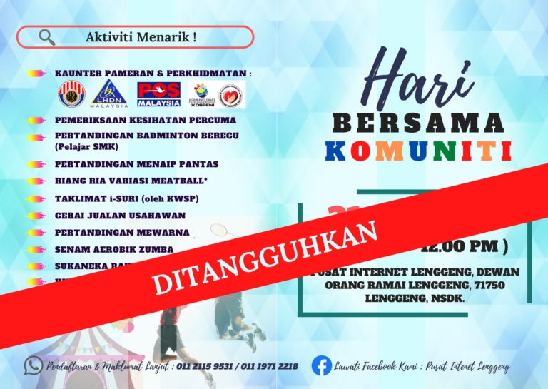 Seperti semua sedia maklum dan bagi yang telah mendapat flyers/poster jemputan program..Program Hari Bersama Komuniti di Pusat Internet Lenggeng akan DITANGGUHKAN ke satu tarikh yang akan dimaklumkan kelak. Hal ini berkait rapat dengan isu Covid19 yang semakin menular dan membimbangkan […]