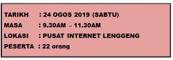 TARIKH : 02 SEPTEMBER 2019 (ISNIN) MASA : 11.05AM – 12.05PM TEMPAT : BILIK ICT, PI LENGGENG PESERTA : 1 ORANG Tujuan Membantu peserta belajar menaip dengan kaedah yang betul. Aktiviti 1. Petugas membantu peserta membuka pautan […]