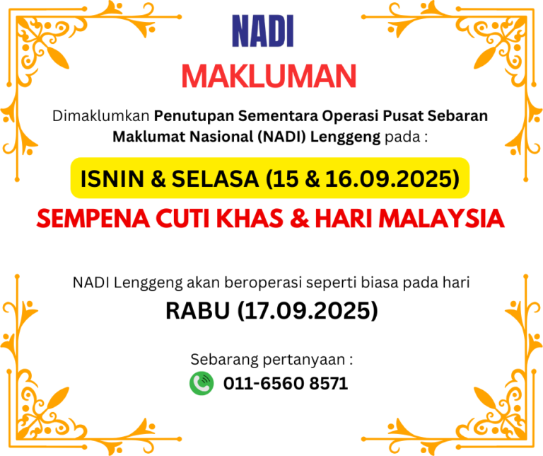 Makluman penutupan sementara operasi NADI Lenggeng pada 15 & 16 September 2025 (Isnin & Selasa) sempena Cuti Khas & Sambutan Hari Malaysia.