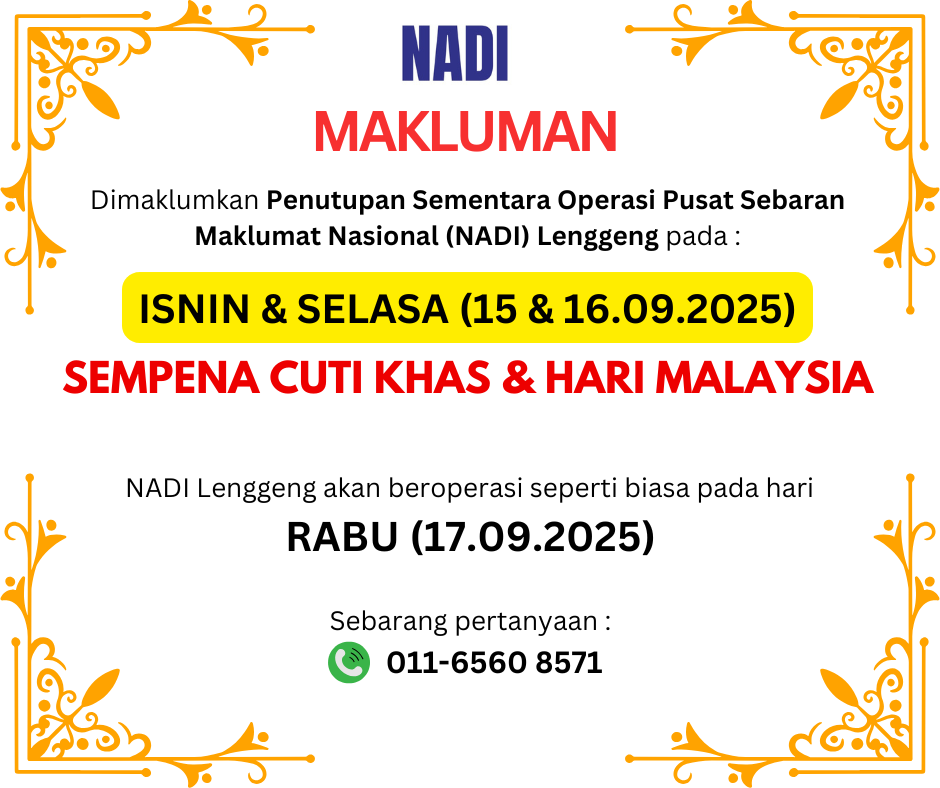 Makluman penutupan sementara operasi NADI Lenggeng pada 15 & 16 September 2025 (Isnin & Selasa) sempena Cuti Khas & Sambutan Hari Malaysia. NADI Lenggeng beroperasi seperti biasa pada 17 September 2025 (Rabu) bermula jam 9 pagi 6 petang. NADI Lenggeng […]