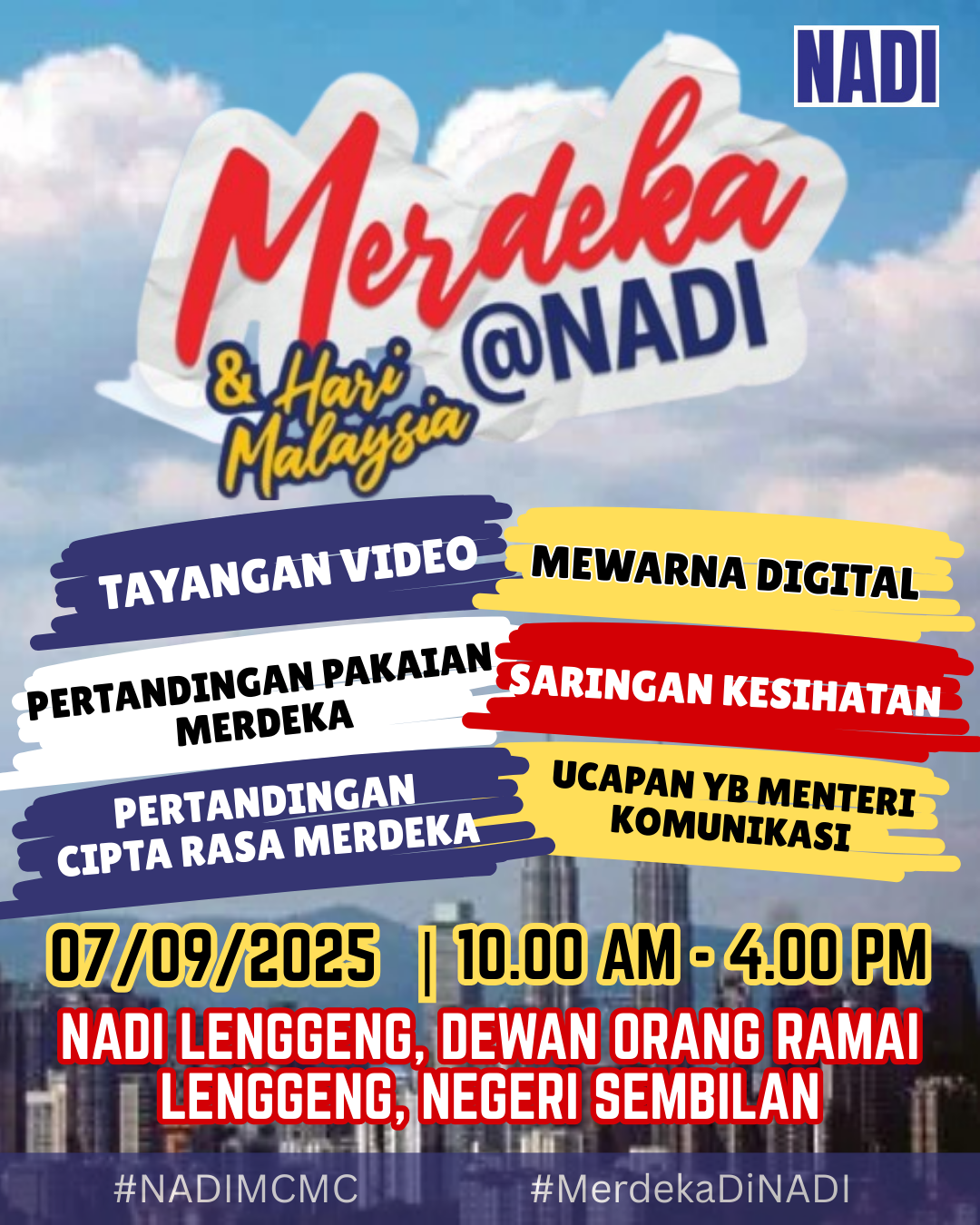 Makluman penutupan sementara operasi NADI Lenggeng pada 31 Ogos 2025 (ahad) sempena Sambutan Hari Kemerdekaan ke-68. NADI Lenggeng beroperasi seperti biasa pada 1 September 2025 (Isnin) bermula jam 9 pagi 6 petang. NADI Lenggeng mengucapkan selamat menyambut Hari Kemerdekaan ke-68! […]