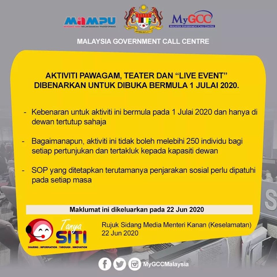 – Kebenaran untuk aktiviti ini bermula pada 1 Julai 2020 dan hanya di dewan tertutup sahaja – Bagaimanapun, aktiviti ini tidak boleh melebihi 250 individu bagi setiap pertunjukan dan tertakluk kepada kapasiti dewan – SOP yang ditetapkan terutamanya penjarakan sosial […]